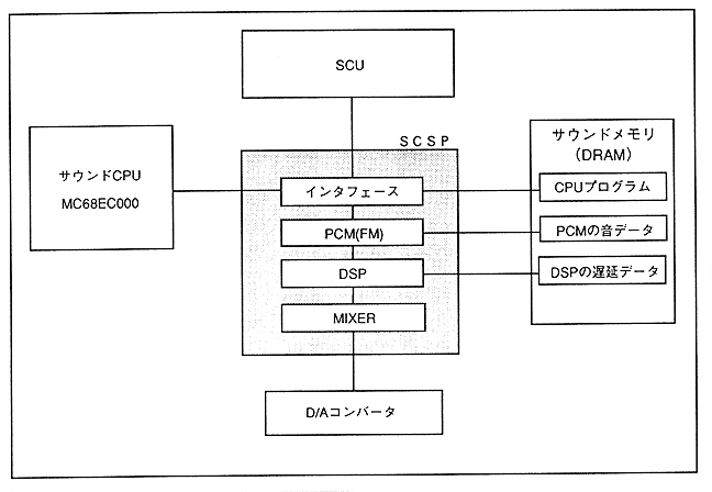 The main CPU, sound CPU, sound memory, and D / A converter are connected to SCSP. These can operate independently of the main process in this sound system.