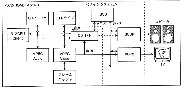 ∙ Sub CPU, CD buffer, frame buffer, and C / D I / F are connected to MPEG / Video. Receives compressed image data from the CD buffer and writes the playback image data to the frame buffer (drawing). The rendered frame buffer data is subjected to effects according to the register settings and displayed on the display device via VDP2 which controls screen display. Or it can be transferred to VDP1 and VDP2 VRAM via CD I / F and SCU.