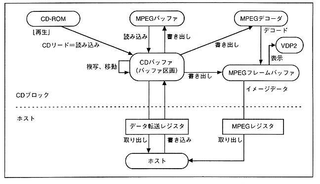 The CD-ROM system temporarily stores the data read from the CD-ROM in the CD buffer. The stored data is written to and read from MPEG and the main system according to commands from the main system.