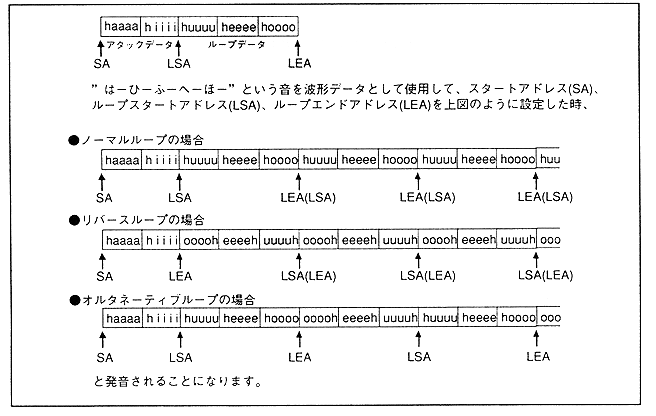 When using the normal loop and reverse loop, the data corresponding to “SA + LSA” (loop start address) in the waveform data and the data corresponding to “SA + LEA” (loop end address) are the same value. Set to. By using the same method for the alternative loop, the pitch of the normal loop and reverse loop can be matched.