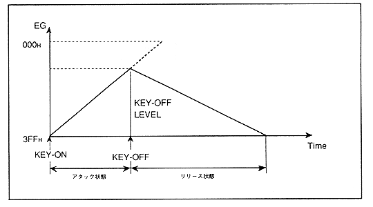 When KEY-OFF is performed, attenuation (increased as the value of EG) will be performed from the current level (KEY_OFF LEVEL) according to the set value of the release rate ("RR"). Therefore, the envelope curve in this case looks like the decay 1 state and decay 2 state are missing. In this case, the EG value does not reach "000H" and increases to "3FFH" at the KEY_OFF boundary.