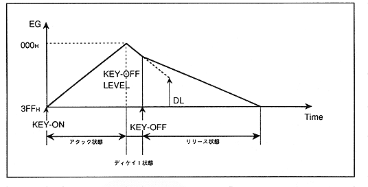When entering the Decay 1 state, the value decays toward DL (Decay Level) according to the D1R (Decay 1 Rate) setting. If KEY_OFF is executed in the middle of this, it will be attenuated according to the set value of RR (release rate) from the level (KEY_OFF-LEVEL) at the time of KEY_OFF.