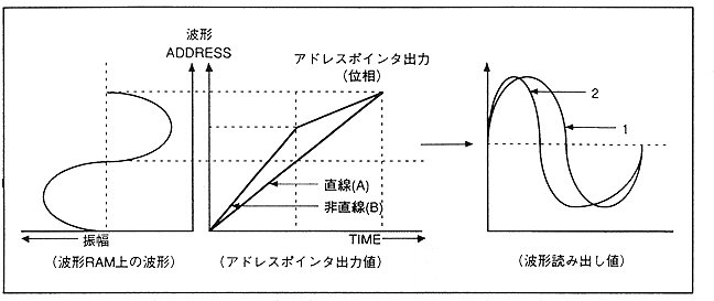 When the output value of the address pointer is linear (A waveform) as shown in Fig. 4.24, it is output according to the RAM waveform (1 waveform). However, when it becomes a non-linear function (waveform B), the way the waveform is read out changes and the second waveform is output. When the waveform is deformed in this way, the tone changes.