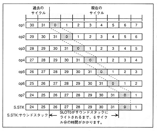 】 Slot operations start at slot 0 and progress toward slot 31, so the slots are written in order from the youngest to the sound stack. However, there is a time difference between the calculation of the slot and the time the slot is written to the sound stack. For example, it takes 6 cycles before slot 0 is written to the sound stack, as shown in Figure 4.31.