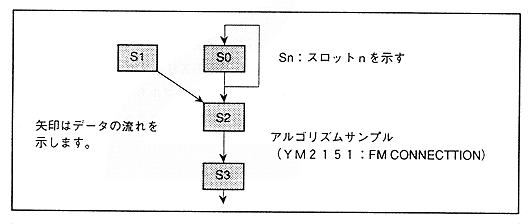 slot is the data in the sound stack ("SOUS"). Therefore, modulating in one slot means assigning and connecting the sound stack corresponding to the modulation slot to the modulated slot. As an actual function, there is "MDXSL" and "MDYXL" that select the sound stack to be input to the modulation inputs Y and X, so it is necessary to set the parameters obtained by the arithmetic method explained earlier in this register there is.