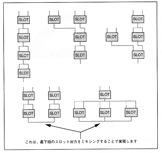 Figure 4.47 and Figure 4.48 show specific examples of basic FM configuration. Please refer to it for FM speech synthesis. The upper two lines of each slot represent the modulation input, and the lower line represents the slot output.