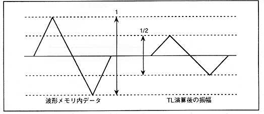 Also, if only bit 4 is set to "1B", the amplitude of the output waveform after TL calculation will be 1/2 of the amplitude in the waveform memory as shown in Figure 4.50.