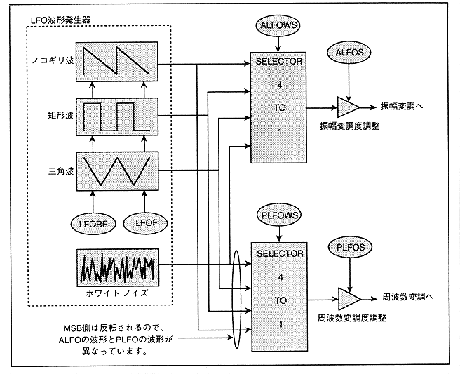 ∙ There are four types of LFO output waveforms: sawtooth state (sawtooth wave), rectangular wave (square wave), triangular wave, and noise (white noise), and these can be selected arbitrarily.