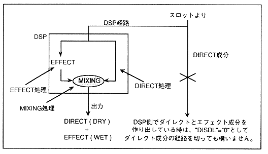 ∙ When effects are applied to the sound, the sound without effect (dry) and the sound with effect (wet) are mixed with an appropriate balance according to each scene. Since the installed effect program is divided into dry and wet inside the DSP and finally mixed, there is no need to output the direct component when creating dry and wet components in the DSP. This can be disabled by setting DISDL to "0". Figure 4.54 shows the direct component and effect component paths.
