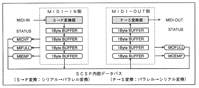 When receiving on the MIDI-IN side, the data transferred from the outside is automatically taken into the MIDI-IN buffer “MIBUF”.