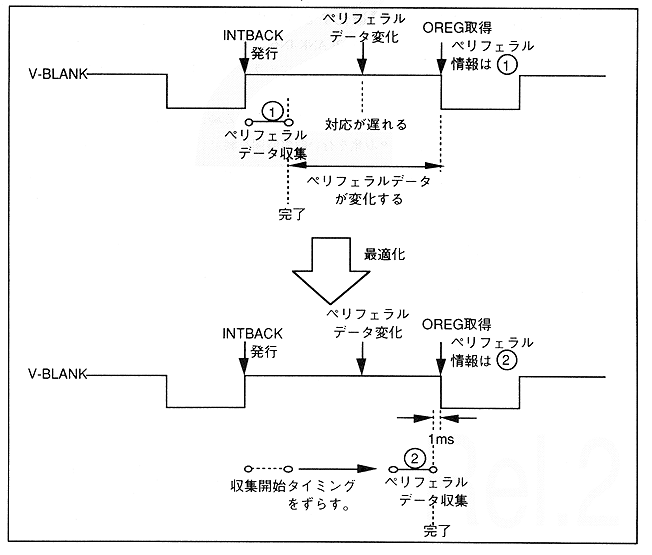 The purpose of optimizing the peripheral data collection time is to collect peripheral data at a timing as close as possible to V-BLANK-IN. In other words, start collecting peripheral data as close to V-BLANK-IN as possible, and minimize the time from peripheral data collection until SH-2 acquires the peripheral data. Figure 3.5 shows an overview of the peripheral data collection time optimization operation.