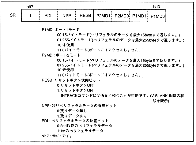 * SMPC outputs the peripheral control status to the status register (SR) when using the SMPC control mode. The status register (SR) can be read regardless of the INTBACK command. However, if this register is read while the INTBACK command is not being used, the bits other than the RESB bit are undefined.