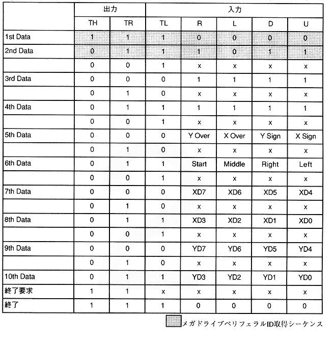 Y Over, X Over 0: X or Y data is valid. * 1. Data overflows. (Over 255) Y Sign, X Sign 0: X, Y data is a positive value. : Data of 1: X, Y is a negative value. XD7 to XD0, YD7 to YD0 Absolute value of mouse movement 1 when the Start, Middle, Right, Left button is pressed.
