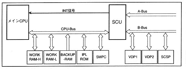 Figure 1.1 shows the system configuration. WORK RAM-H, WORK RAM-L, BACKUP-RAM, IPL ROM, and SMPC are connected to CPU-Bus, and system reset signals and control pad control are executed.