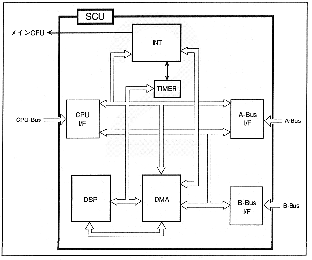 - Figure 1.2 shows the block diagram of SCU. As mentioned before, SCU is equipped with CPU, A-Bus, B-Bus interfaces, DMA controller, interrupt controller, DSP, and so on.