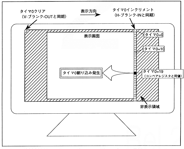 The value is cleared when a V-blank-OUT interrupt is received, and is incremented when an H-blank-IN interrupt is received. Compared to the timer 0 compare register (see register details), a timer 0 interrupt is generated when the values are the same. Figure 2.12 shows the timer 0 generation process.