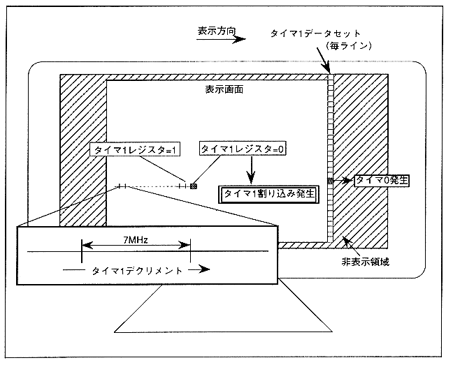 The timer 1 data set register (see register details) data is set in timer 1 when an H-blank-IN interrupt is received. The timer counts down at a frequency of approximately 7MHz (1 dot drawing), which is 1/4 of the system clock. Depending on the value of the timer 1 mode register (see register details), an interrupt can be generated at one point in combination with timer 0, or an interrupt can be generated for each line regardless of timer 0. Figure 2.13 shows the process from generating a timer 1 interrupt in synchronization with timer 0.