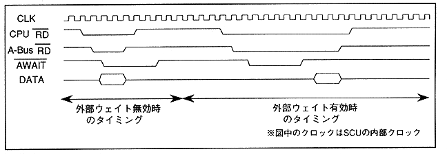 When accessing the CS0 space via A-Bus, a wait can be forced by an external signal, but this bit determines whether to enable or disable the processing. 1 means valid, 0 means invalid. When enabled, the wait continues while the external wait signal is low at the SCU wait sampling point. Figure 3.29 shows the timing chart difference between when external weights are disabled and when they are enabled.