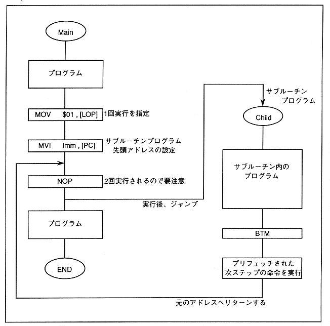 DSP programs (mnemonics) do not have dedicated instructions for subroutine execution. The subroutine is realized in the form shown in Figure 4.4 by combining the Load immediate instruction to [PC] and the LOOP BOTTOM instruction.