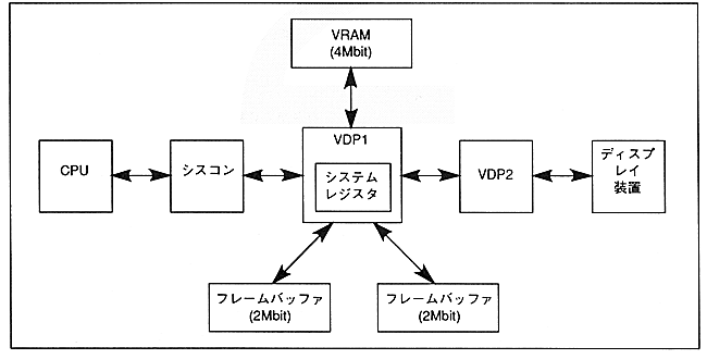 VRAM (4Mbit DRAM) and two frame buffers (2Mbit DRAM per side) are connected to VDP1. Image data is defined from the CPU to VRAM and output to the display device via the frame buffer.