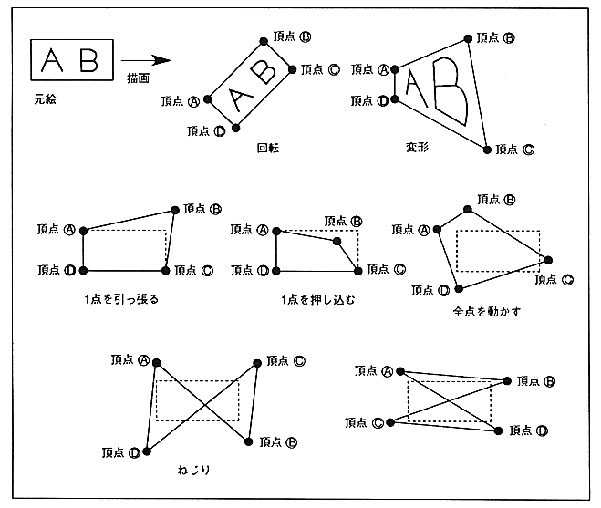Draw a character pattern by specifying four vertex coordinates. Specify the four coordinates of the four vertices of the character pattern. The relationship between the four coordinates is arbitrary, so it can be flipped, scaled, rotated, or twisted according to the specified method.