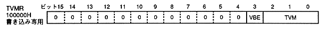 - TV mode selection register (TVMR, TV mode register) specifies V blank erase permission and TV display mode. This is a write-only 16-bit register located at 100000H. The value is undefined after power-on or reset, so be sure to set the TV display mode. Fix unused bits to 0.