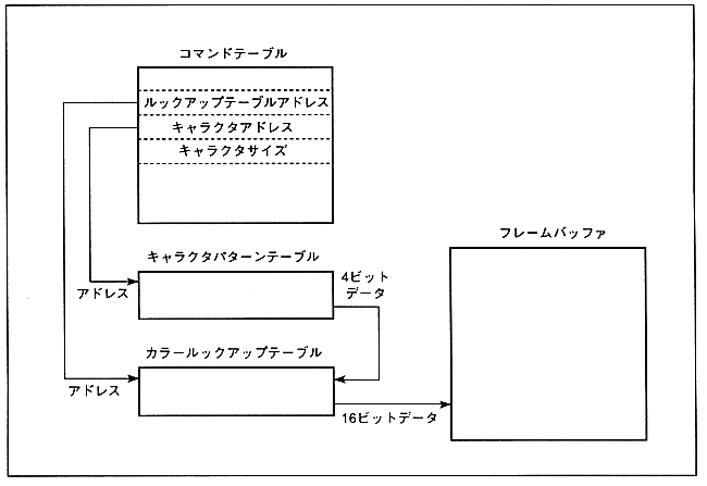The relationship between the command table, color lookup table, and character pattern table is as follows.