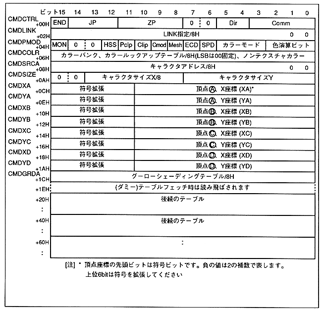 The command table stored in VRAM is fetched from the top address (00000H) every frame. Be sure to store the command table at addresses 00000H to 0001EH. Drawing operations other than the command table (color lookup table, Gouraud shading table, character pattern table) are not guaranteed. VRAM is up to 7FFFFH. Do not define a Gouraud shading table beyond address 80000H.