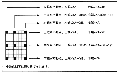 ∙ The area where the character is drawn is determined by the zoom point bit (ZP), fixed point coordinates, and display width. When the fixed point coordinates are (XA, YA) and the display width is (XB, YB), it is as follows.