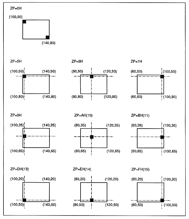 When the fixed point coordinates are (100, 50) and the display width is (40, 30), the coordinates of each vertex are as follows. However, it is assumed that up / down / left / right inversion is not specified. When the zoom point (ZP) is 0H, the vertex is (100, 50) and the vertex is (140, 80).