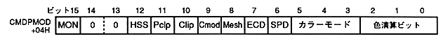 - CMDPMOD is a word that controls clipping enable / disable, mesh processing, transparency code specification, color mode specification, color calculation, and shade processing. It is in 2 bytes (16 bits) from the start address + 04H of the command table. The bit configuration is as follows. Set 0 to unused bits.