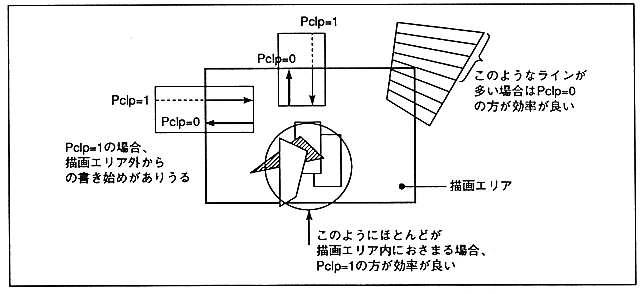 ∙ Lines that are completely out of the drawing area and do not require drawing of the entire line can be detected in advance, and drawing efficiency will be improved if drawing is not started. Also, if one end point of one line is outside the drawing area, it is more efficient to start drawing from within the drawing area (the line is limited to the horizontal or vertical direction).