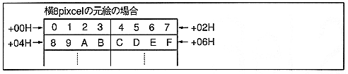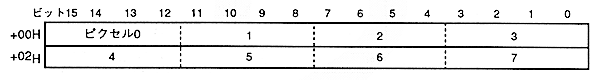 ∙ 4 pixels represent 1 pixel. 16 colors can be drawn. Character data is the same as mode 0.