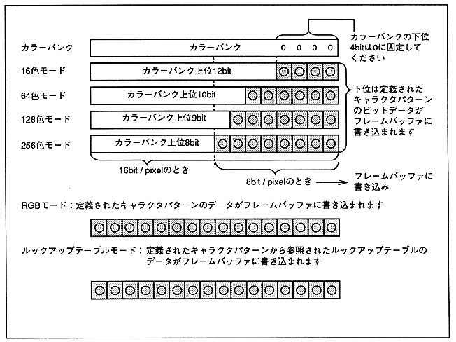 - When the color mode of the texture part is the color bank mode, the color bank is a bit added to the upper bits when writing the pixel data of the character pattern to the frame buffer .