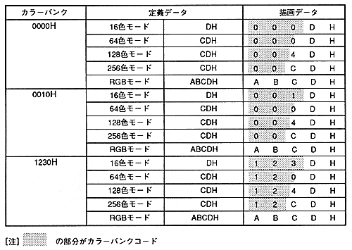 - The relationship between the color bank, defined character pattern data, and drawing frame buffer data is shown below.