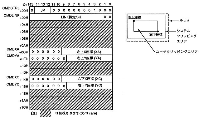 - If the end bit is set to 0B and the command selection bit is set to 1000B, it becomes a user clipping coordinate setting command.