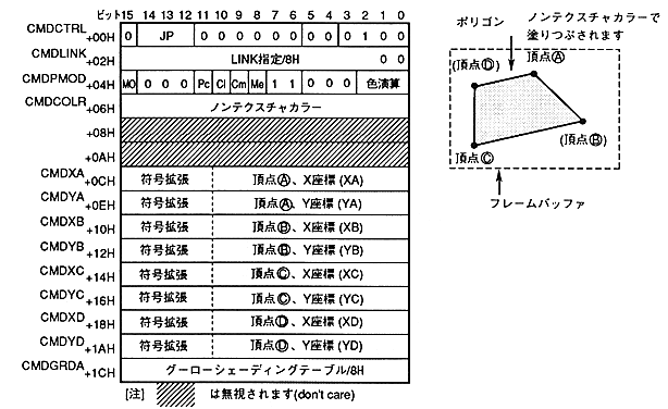 - If the end bit is set to 0B and the command selection bit is set to 0100B, it becomes a polygon drawing command.