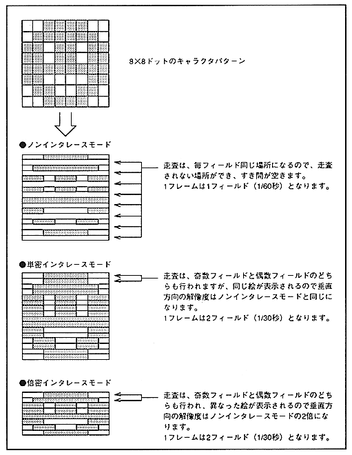 VDP2 interlace mode (screen scanning method) includes non-interlace, single density interlace, and double density interlace. In non-interlace mode, one frame is one field (1/60 second). In single density interlace mode, one frame consists of two fields (1/30 seconds), but the same image is displayed in even and odd fields. In double-dense interlace mode, one frame consists of two fields (1/30 seconds), and separate images are displayed for even and odd fields. In both the single density interlace mode and the double density interlace mode, there is no gap between the scan lines. Will be the same. Figure 2.1 shows how to display with interlace settings.
