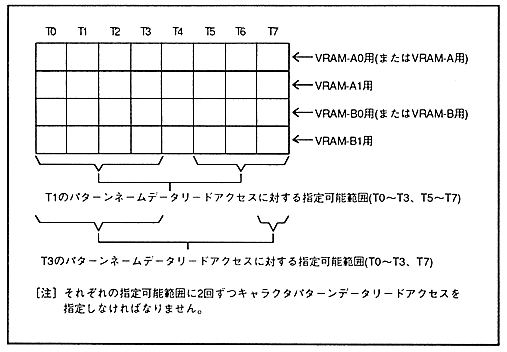 If the reduction setting is 1 and character pattern data read access is required more than once, all character pattern data read access must comply with the specified restrictions. If the reduction setting is 1/2 or 1/4, the number of accesses required when the reduction setting is 1 time (1 when the number of character colors is 16 or 2 when the number of characters is 256) , You must ensure that you comply with the restrictions imposed by one pattern name data read access. For example, when the number of character colors is 256 and the reduction setting is 1/2, the specification restrictions on character pattern data read access when pattern name data read access is specified as T1 and T3 are as shown in Figure 3.4. The