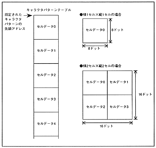 When the character pattern consists of 4 cells, the cell data used for the same character pattern must be stored continuously in the character pattern table. Figure 4.7 shows the relationship between the cell layout according to character size (number of cells in the character pattern) and the character pattern table.