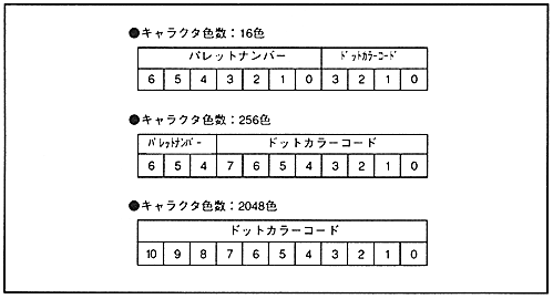 The pallet number is 7-bit data, and specifies the start address of the color pallet used for the character pattern displayed at that position. This data is used only when the color format is palette format, not when it is RGB format. The palette number is attached to the dot color code of the character pattern and combined into 11-bit dot color data, so the bits used depend on the number of character colors. The configuration of 11-bit dot color data is shown in Figure 4.11.