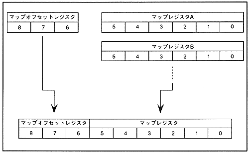 The map is composed of 4 planes (normal scroll screen) or 16 planes (rotary scroll screen), and each screen is a 6-bit to specify the start address of the pattern name table for each plane. Each map register has a number of planes. In addition, there is one 3-bit map offset register attached to the upper part of the map register. In the 9-bit map specification register, the bit used and the address value indicated by the register change depending on the pattern name data size and character size. Figure 4.14 shows the relationship between the map register and map offset register.