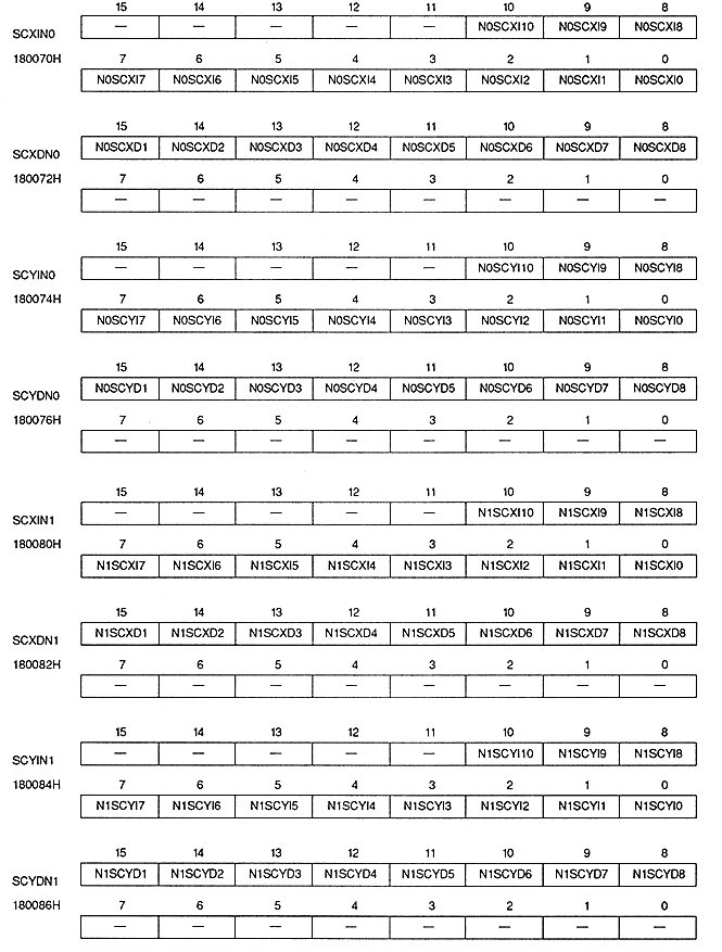 - Screen scroll value register specifies screen scroll value. This is a write-only 16-bit or 32-bit register located at 180070H to 180076H, 180080H to 180086H, and 180090H to 180096H. The value is cleared to 0 after power-on or reset, so be sure to set it.
