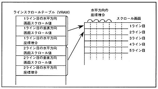 The line scroll function is a function that can specify the screen scroll value in the horizontal and vertical directions and the coordinate increment in the horizontal direction in line units, and is specified by the line scroll table stored in VRAM. The data value of the line scroll table is specified as a relative value. The value specified in the screen scroll value register is added to the screen scroll value stored in the line scroll table to obtain the display coordinates. The table data reading interval can be selected from 4 types of 1 line, 2 lines, 4 lines, and 8 lines. When selecting an interval of 2 lines or more, vertical coordinate calculation is used. The value of the increment register is used.