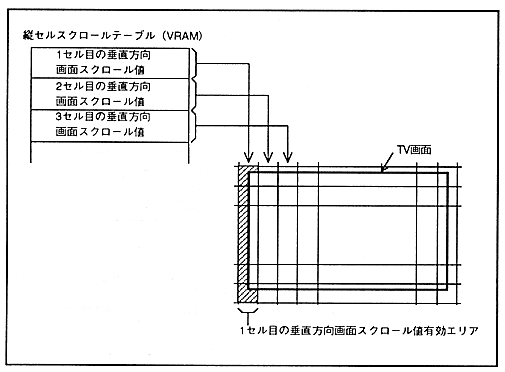 The vertical cell scroll function is a function that can specify the screen scroll value in the vertical direction for each area divided vertically in units of cells in the horizontal direction, and it is specified in the vertical cell scroll table stored in VRAM. The data value of the vertical cell scroll table is specified as a relative value. The value specified in the screen scroll value register is added to the screen scroll value stored in the vertical cell scroll table, and it becomes the display coordinates. When displaying in bitmap format, it can be specified in units of 8 dots in the horizontal direction.