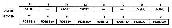 The RAM control register specifies the VRAM bank division, the purpose of use of the VRAM on the rotary scroll screen, and the color RAM mode. This is a 16-bit readable / writable register located at 18000EH. The value is cleared to 0 after power-on or reset, so be sure to set it.
