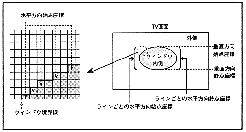 The normal line window is obtained by storing the horizontal start point and end point coordinates for each window line in the VRAM as a table and specifying the vertical start point and end point coordinates in the window position register. The area enclosed by the specified coordinates is inside, and the other area is outside. The window border is considered inside. The normal line window is shown in Figure 8.2.