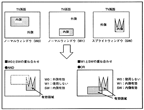 [Figure 8.6 shows the effective area when the normal window and sprite window are overlapped with AND or OR logic.