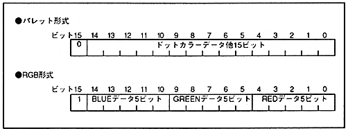 Sprite character data is available in both pallet format and RGB format, similar to the scroll screen. If the number of bits per dot is 16 bits and the data in the frame buffer is only in palette format, all 16 bits can be used with the bit configuration specified by the sprite type. However, when palette format and RGB format data are mixed, the most significant bit is used to determine the color format, so set it to 0 for palette format data and 1 for RGB format data. At that time, the palette format data is processed with the value of the most significant bit (priority bit or shadow bit) of the specified sprite type as 0.