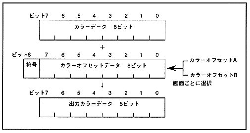 As the color offset value, two values of color offset A and color offset B can be set for each RGB, and you can specify which of these two to use for each screen. The color offset value is 9-bit data corresponding to each RGB, and when the color data added to each RGB is smaller than 00H, the color data is set to 00H and larger than FFH. In all such cases, FFH is assumed.